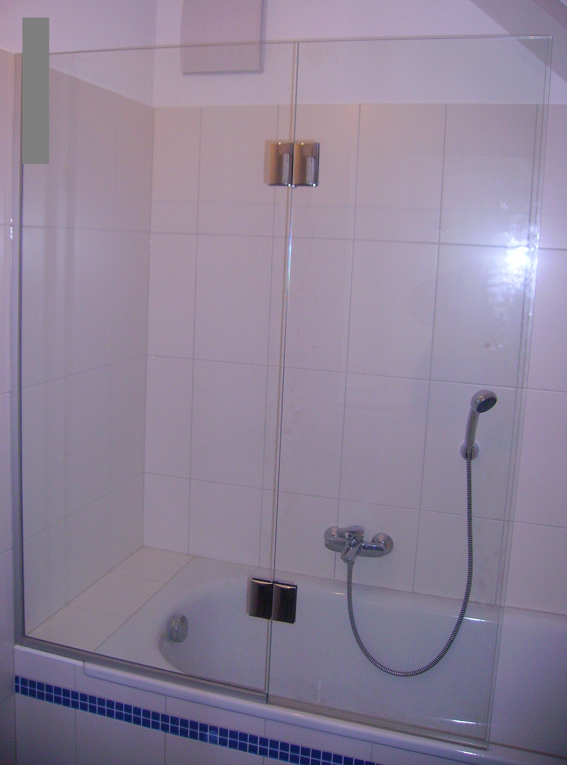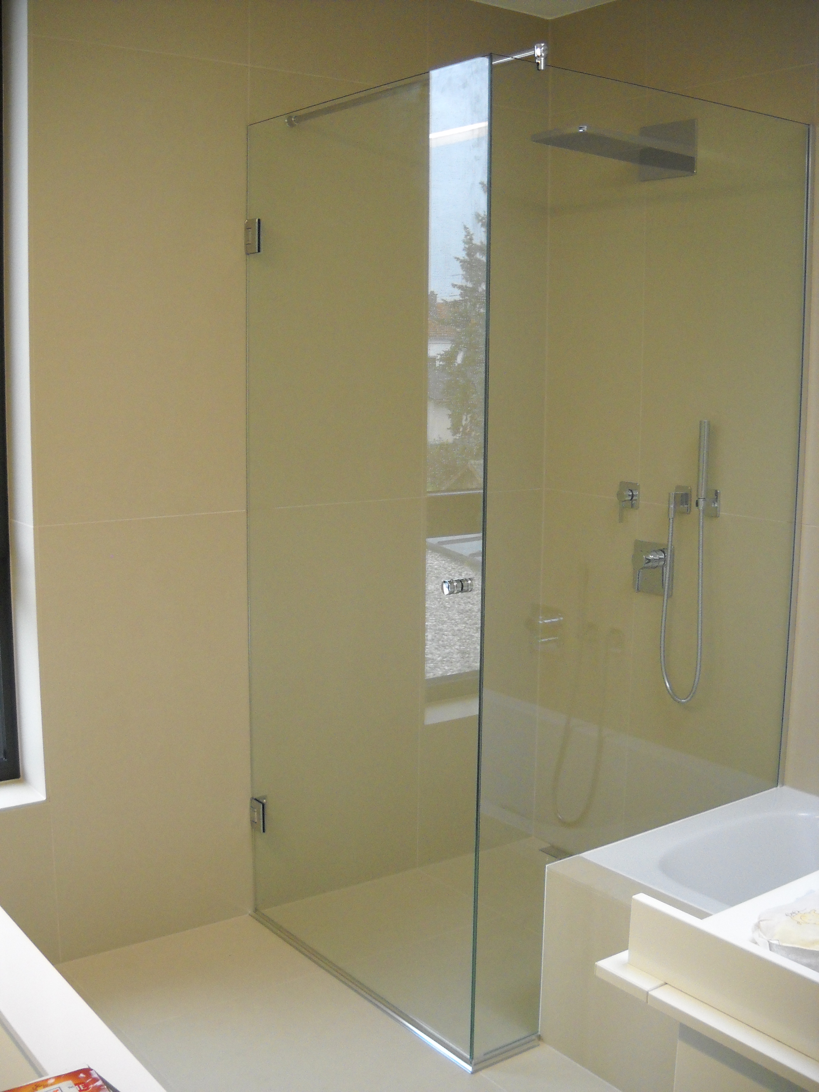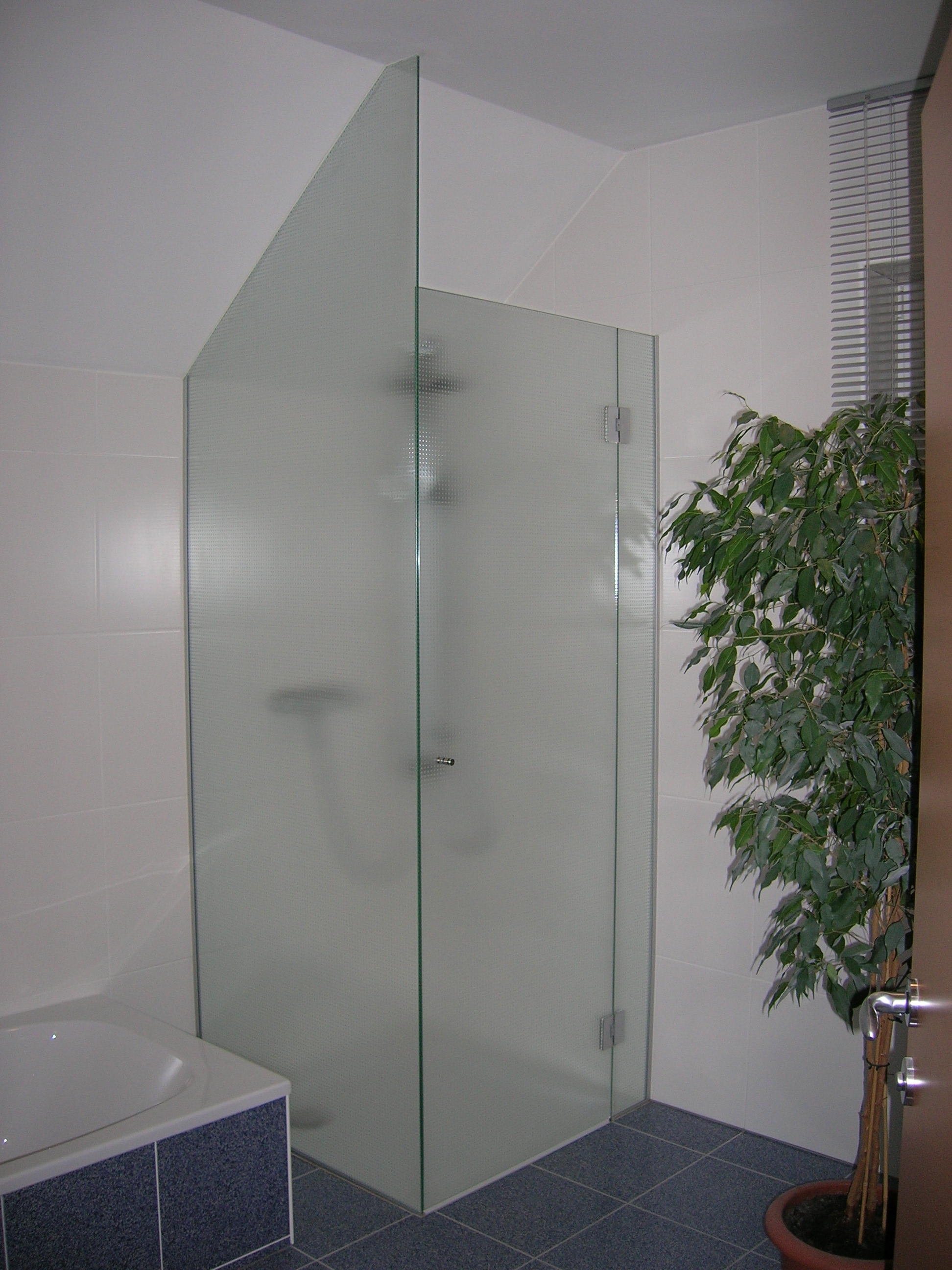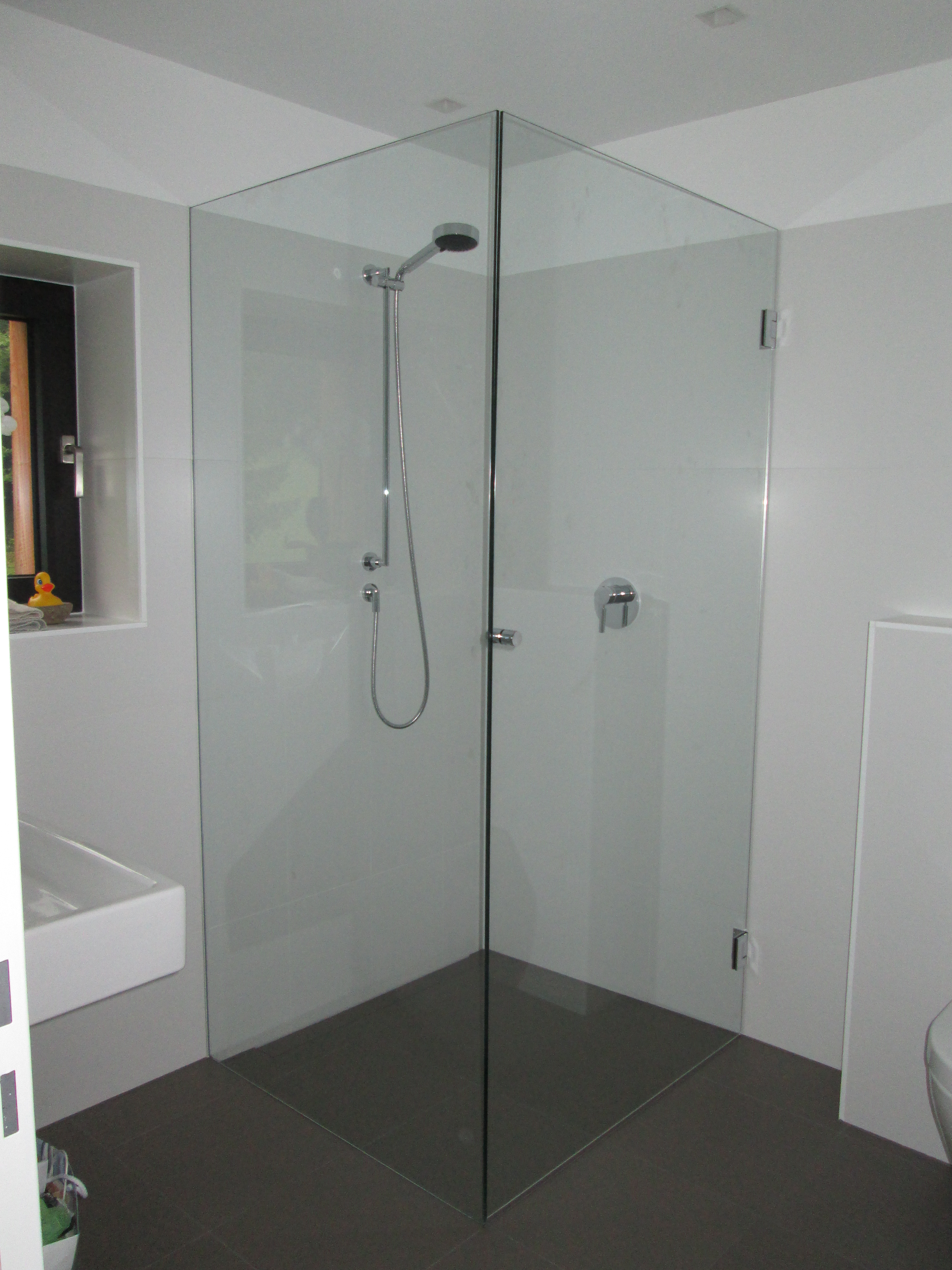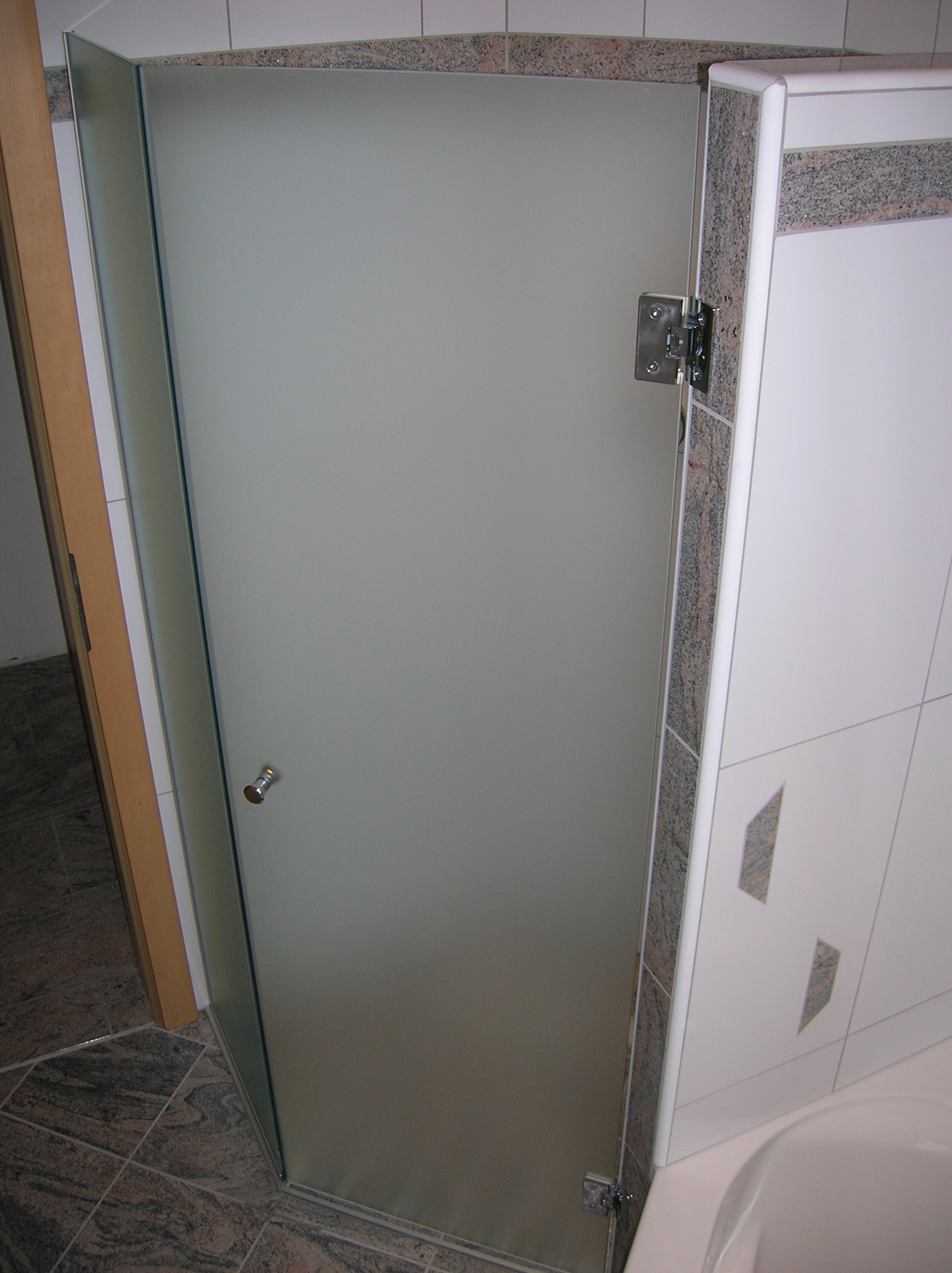 Unsere maßgefertigten Spritzschutzwände und -türen sind mit verschiedenen Scharnieren, Griffen, und Gläsern individuell an Ihre Einbausituation angepasst.