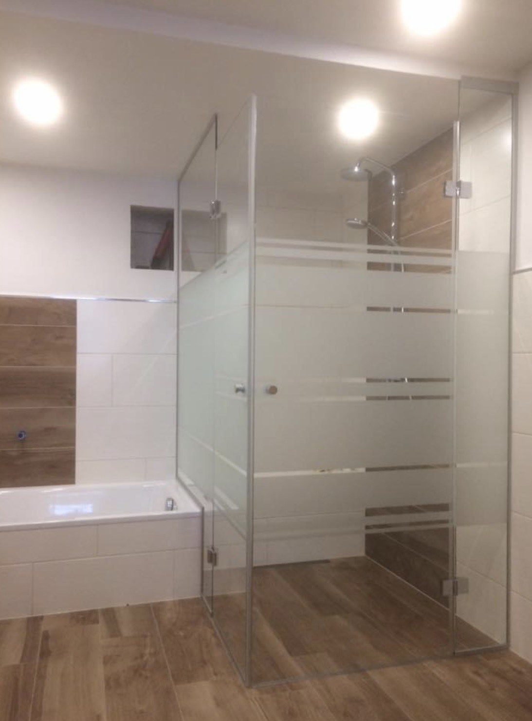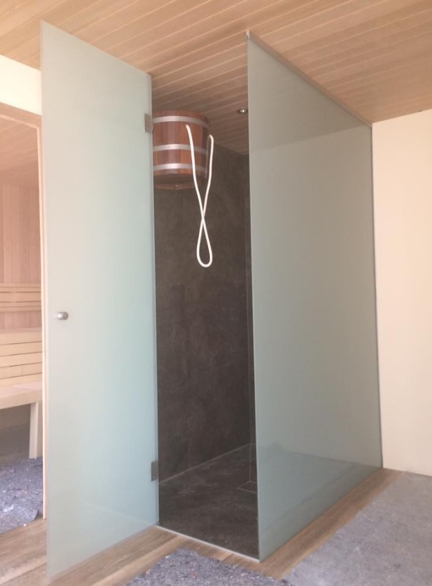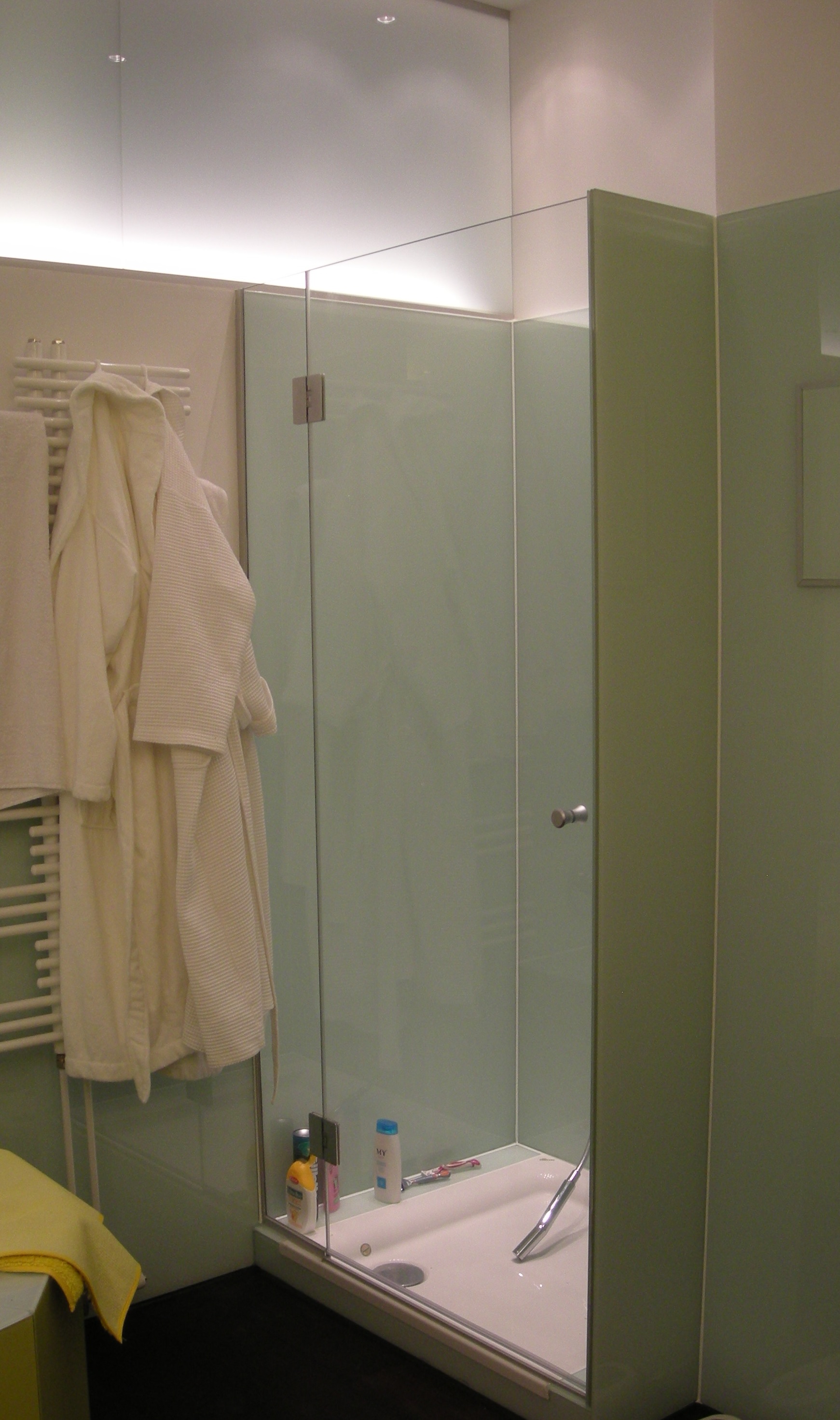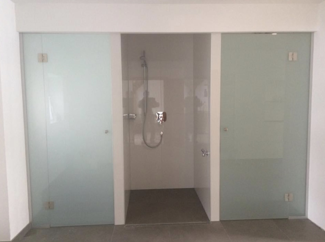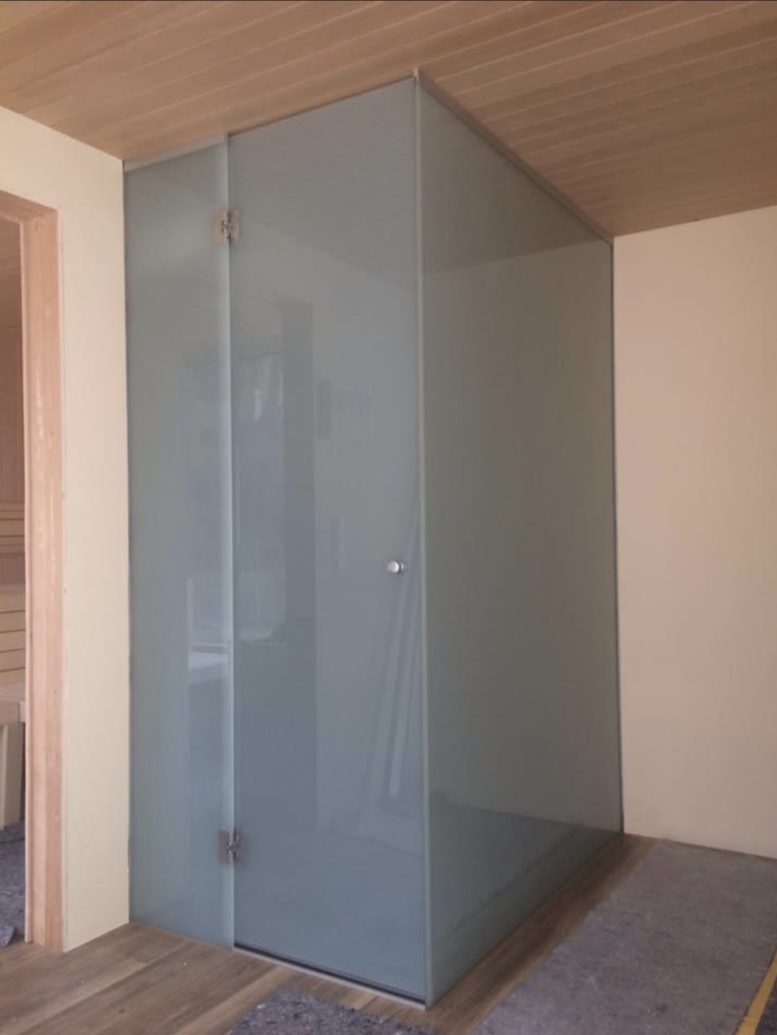 Unsere maßgefertigten Spritzschutzwände und -türen sind mit verschiedenen Scharnieren, Griffen, und Gläsern individuell an Ihre Einbausituation angepasst.