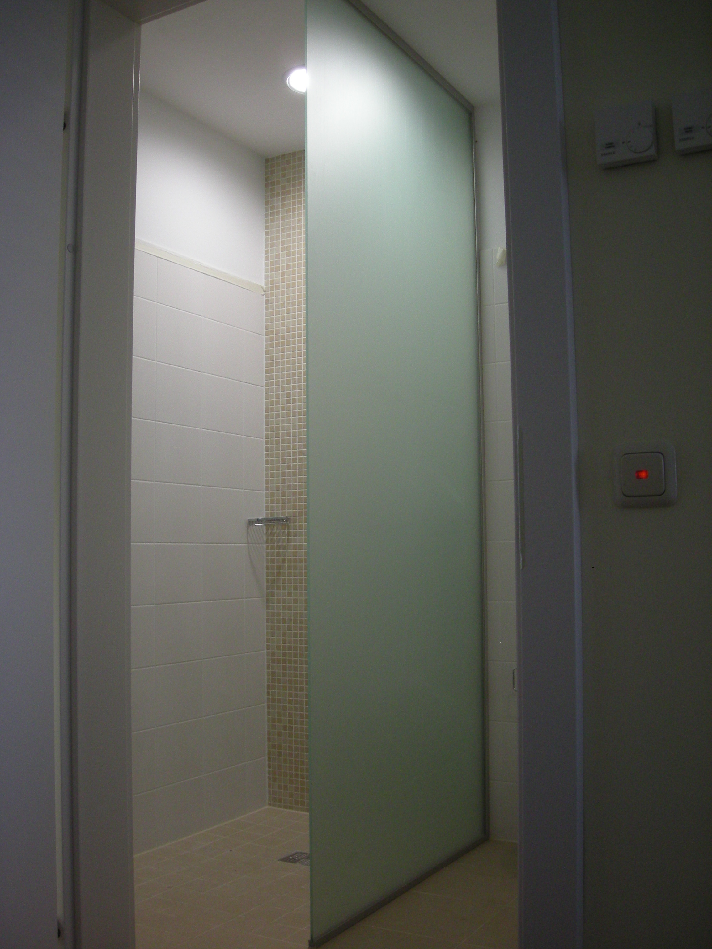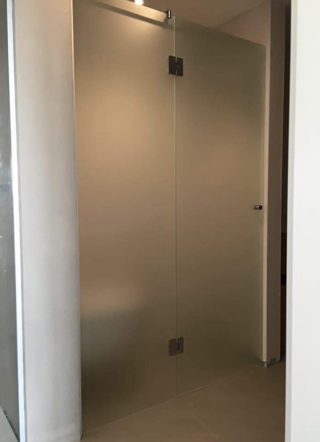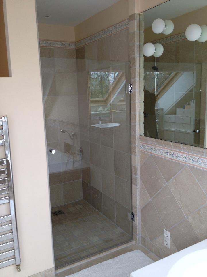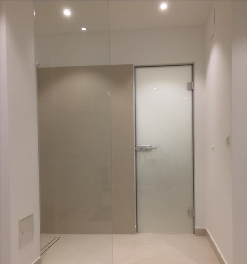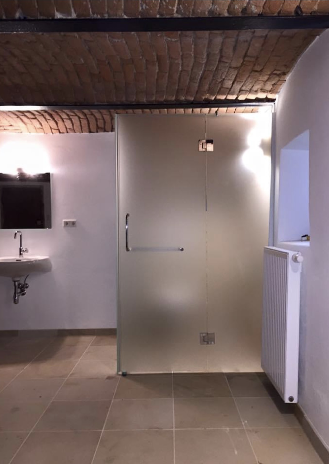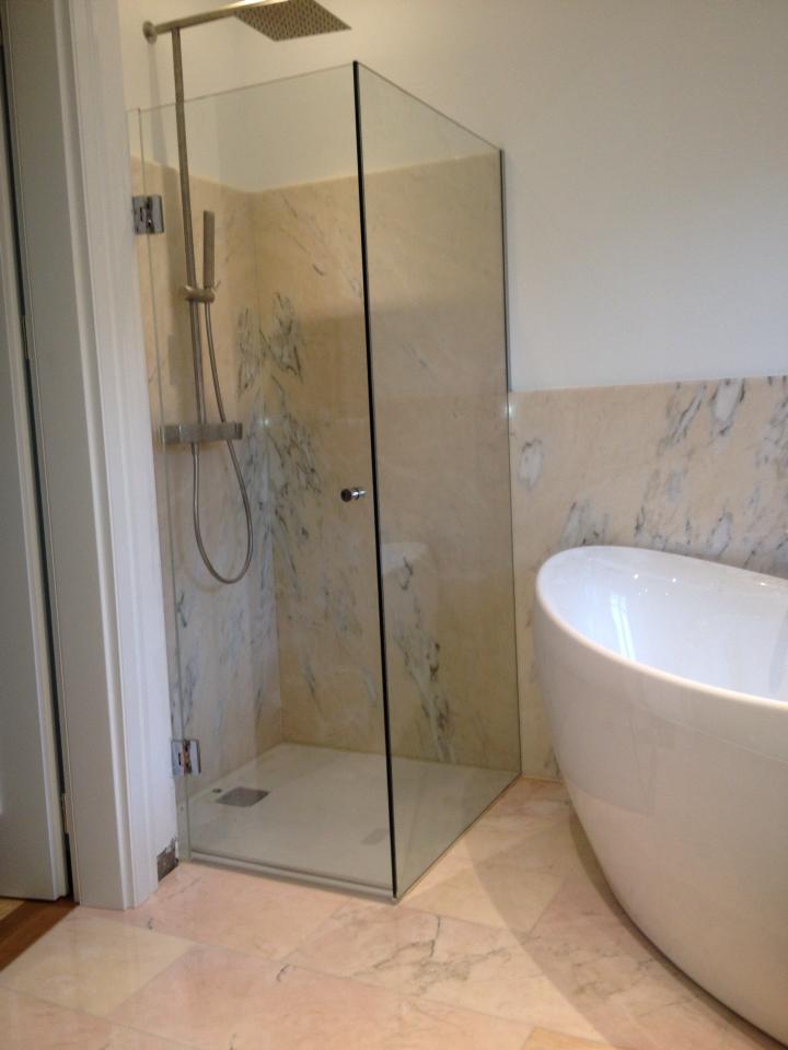 Unsere maßgefertigten Spritzschutzwände und -türen sind mit verschiedenen Scharnieren, Griffen, und Gläsern individuell an Ihre Einbausituation angepasst.